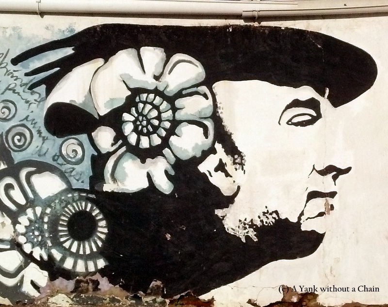 A portrait of Neruda on a wall outside his Santiago home